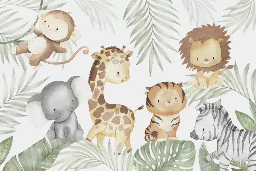 Selva, palmeras, jirafa, elefante, cebra, acuarela, color beige, platanero, flores