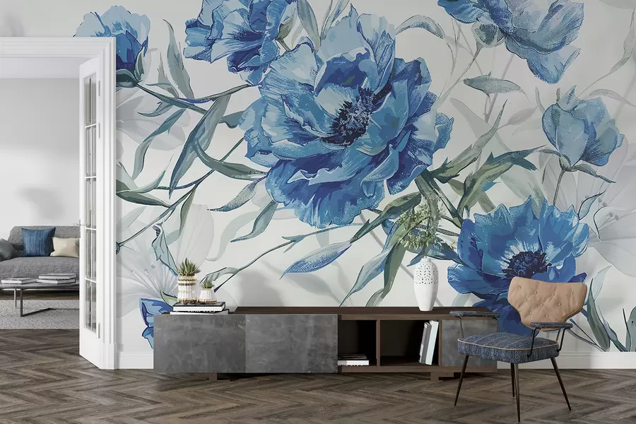 Pintura de peonías azules con exuberante follaje sobre un fondo abstracto claro