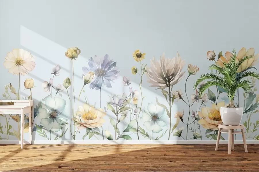 Delicadas flores azules y blancas en forma de acuarela con suaves pétalos y fondo difuminado