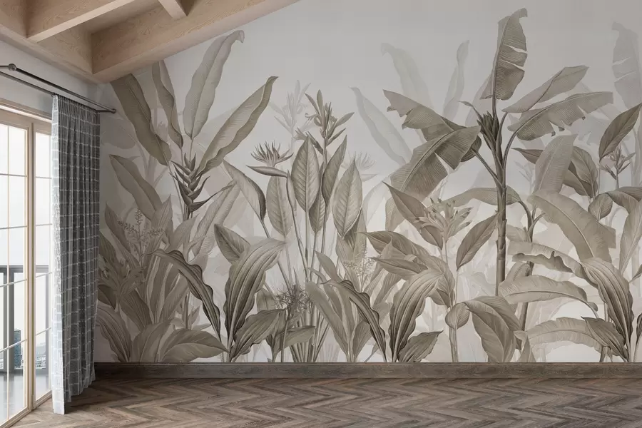 dibujadas grandes hojas de plátano en tonos grises
