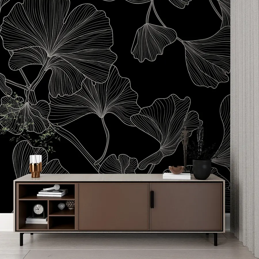 Un patrón de delicadas hojas de ginkgo en tonos beige, tostado y azul sobre un fondo claro.