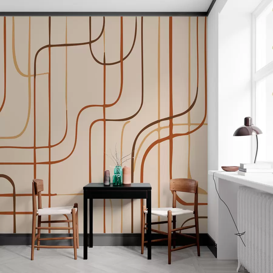 Una ilustración minimalista de una forma circular con elementos abstractos parecidos a plantas en tonos tierra apagados.