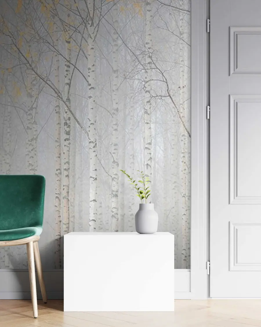 Bosque de abedules en la niebla