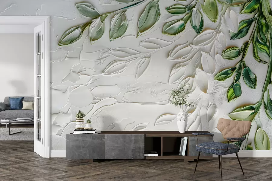 Pintura al óleo 3D con rama verde sobre fondo blanco, diseño minimalista en estilo boho