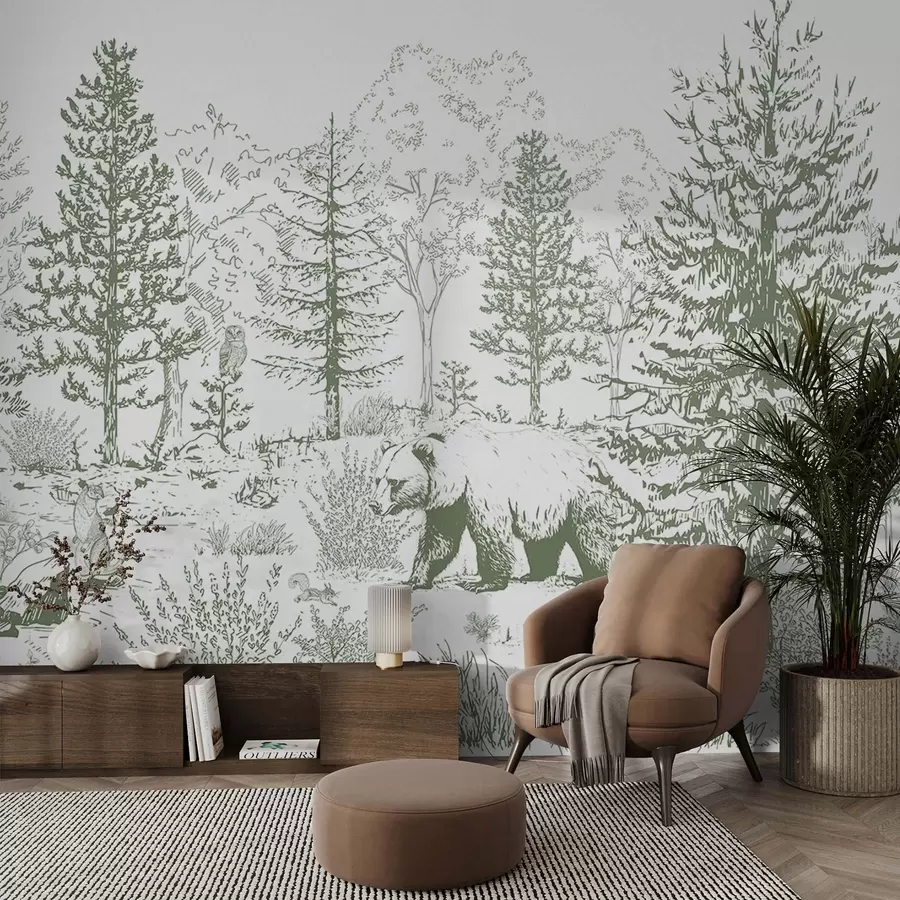 Vida en el bosque, árboles, animales salvajes, oso, zorro, búho, arbustos, dibujo a lápiz, colores verdes