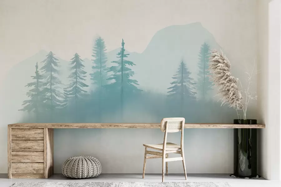 Paisajes de montañas acuarelas, bosques, colores verdes y beige naturales.
