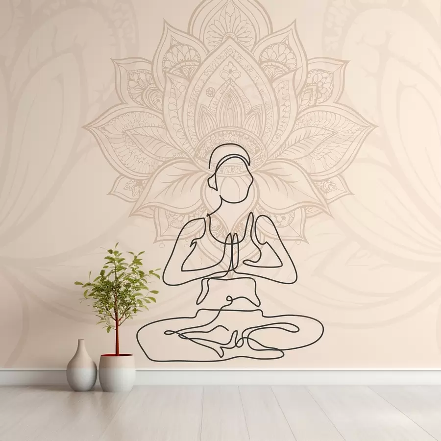 Abstracción floral con dibujo lineal de Buda, colores beige