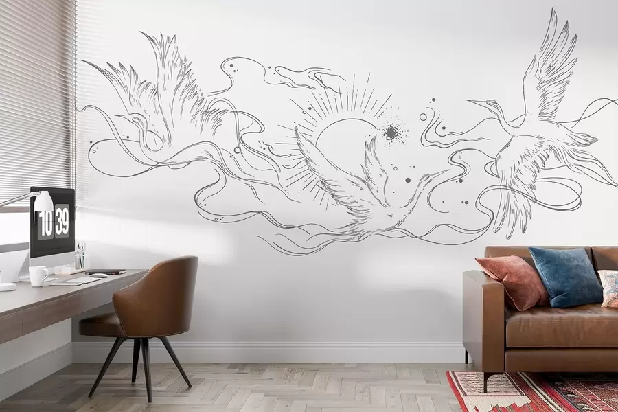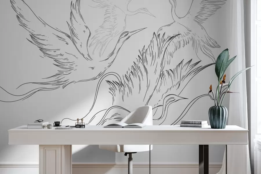 Pájaros voladores, dibujo lineal, minimalismo, paleta de colores grises