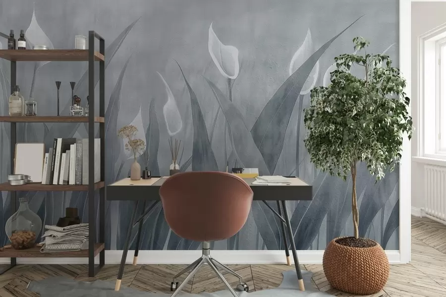 Grandes y delicadas hojas de color beige sobre un fondo gris apagado, que crean una atmósfera serena y etérea