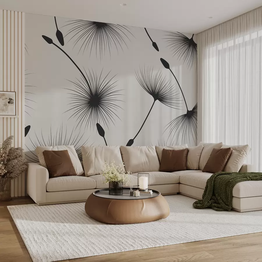 Flores de diente de león blancas y negras con esponjosas cabezas de semillas sobre un fondo de textura blanca y gris claro