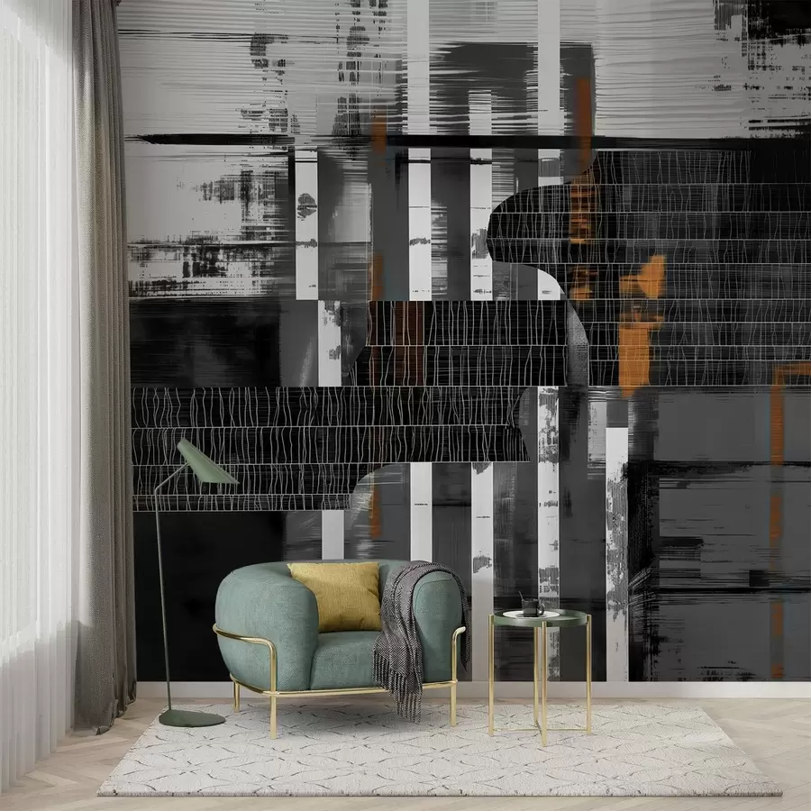 Formas abstractas en tonos blancos, grises y negros sobre un fondo de textura difuminada
