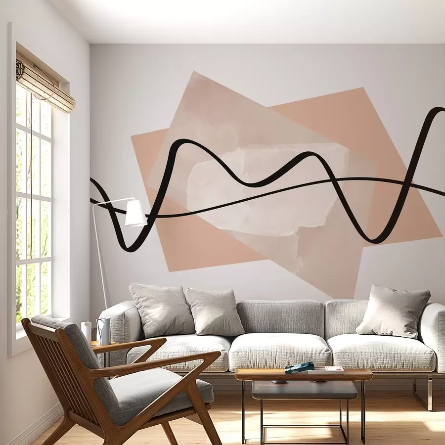 Moderno diseño geométrico de papel pintado con formas superpuestas en suaves tonos beige, verde y gris