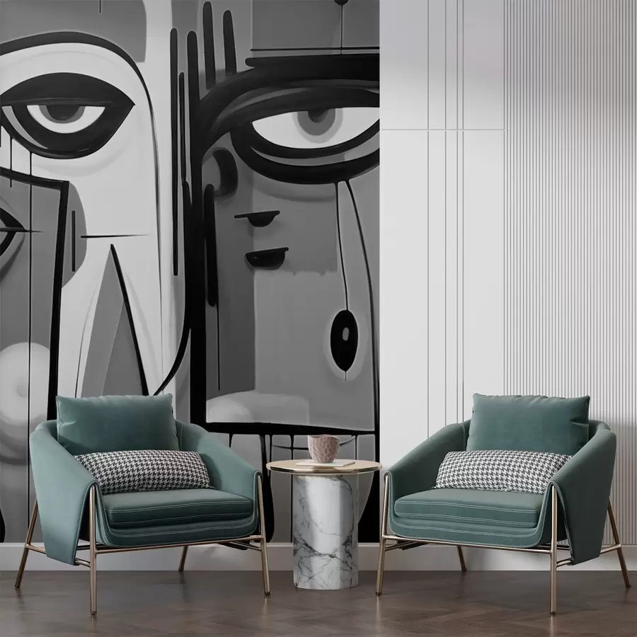 Op art estilo enrejado con la cara abstracta, líneas onduladas sobre fondo de color claro.