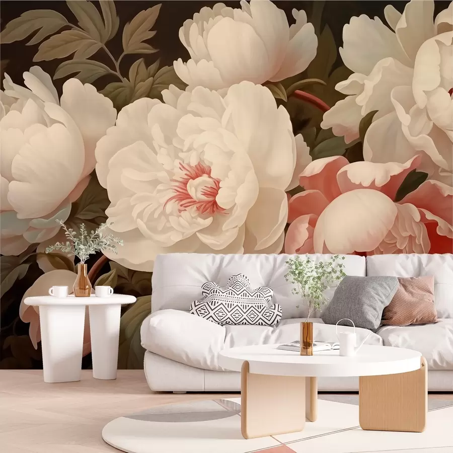 Delicadas peonías rosas y blancas con exuberantes hojas verdes sobre un fondo de acuarela claro.