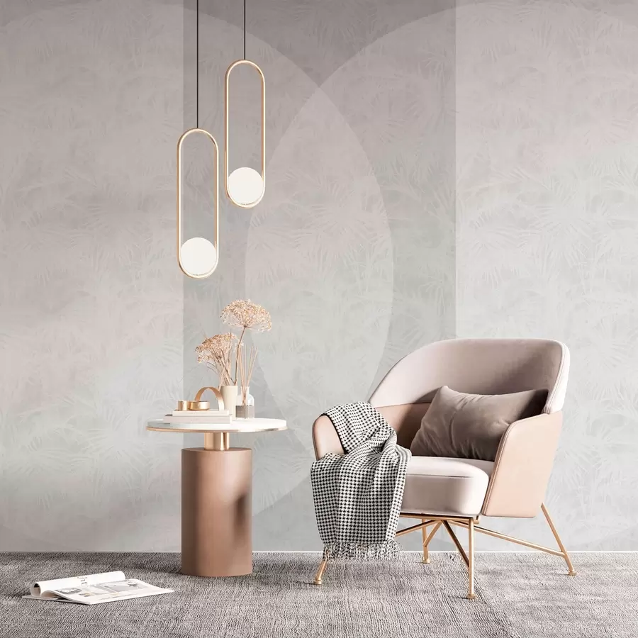 Estampado abstracto con formas geométricas, arcos y hojas tropicales sobre fondo blanco
