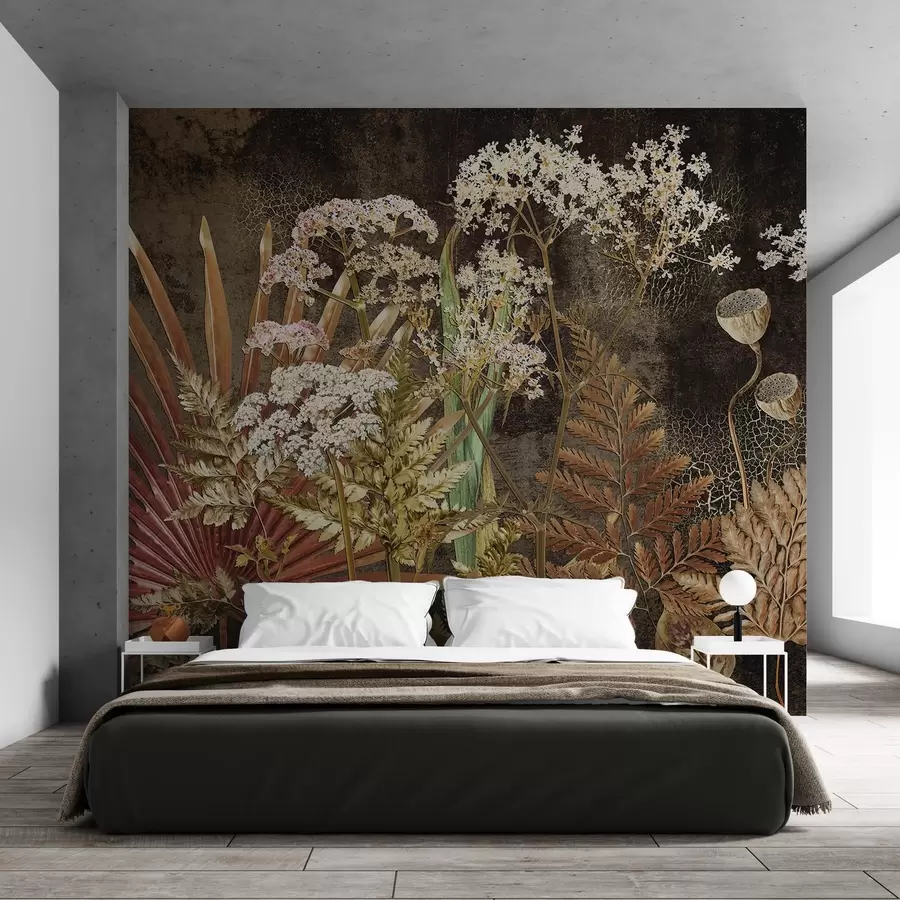 hojas y flores abstractas en tonos empolvados y beige