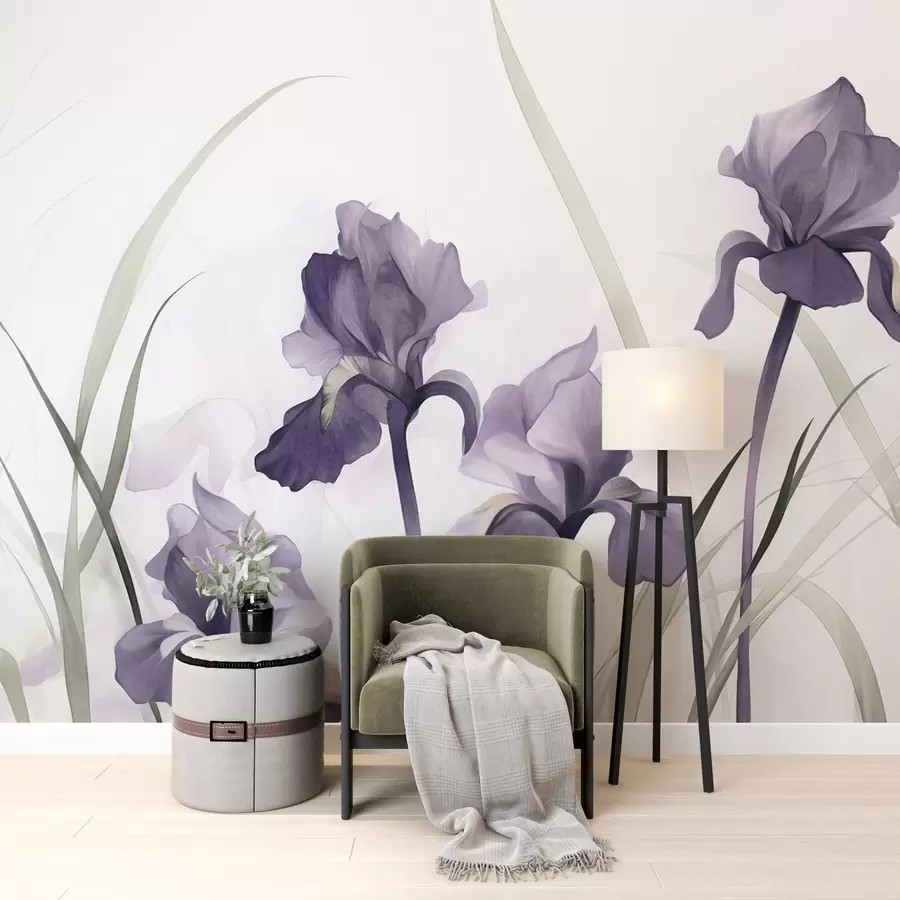 Flores de iris moradas con tallos verdes, estilo acuarela, fondo blanco, colores suaves, elegante, artístico