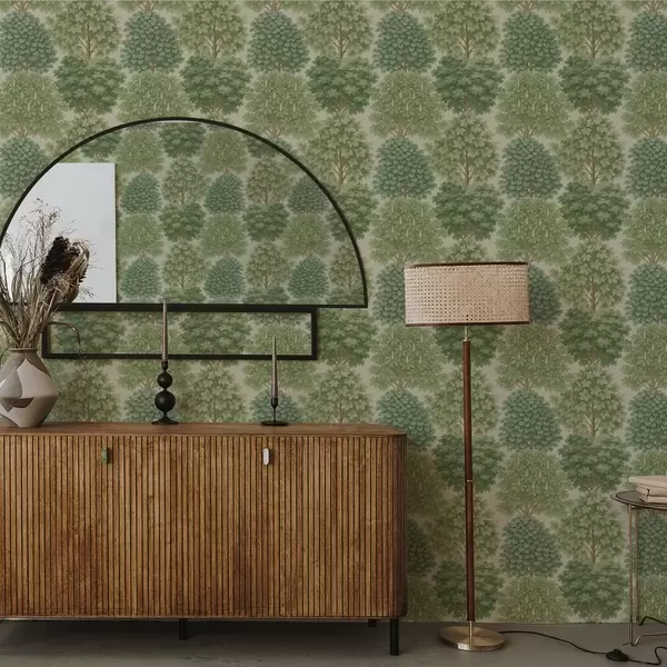 Papel pintado Jardín de árboles en suaves tonos verdes sobre un fondo claro. a00775