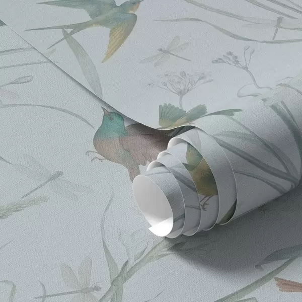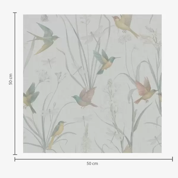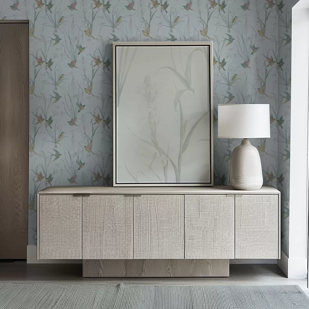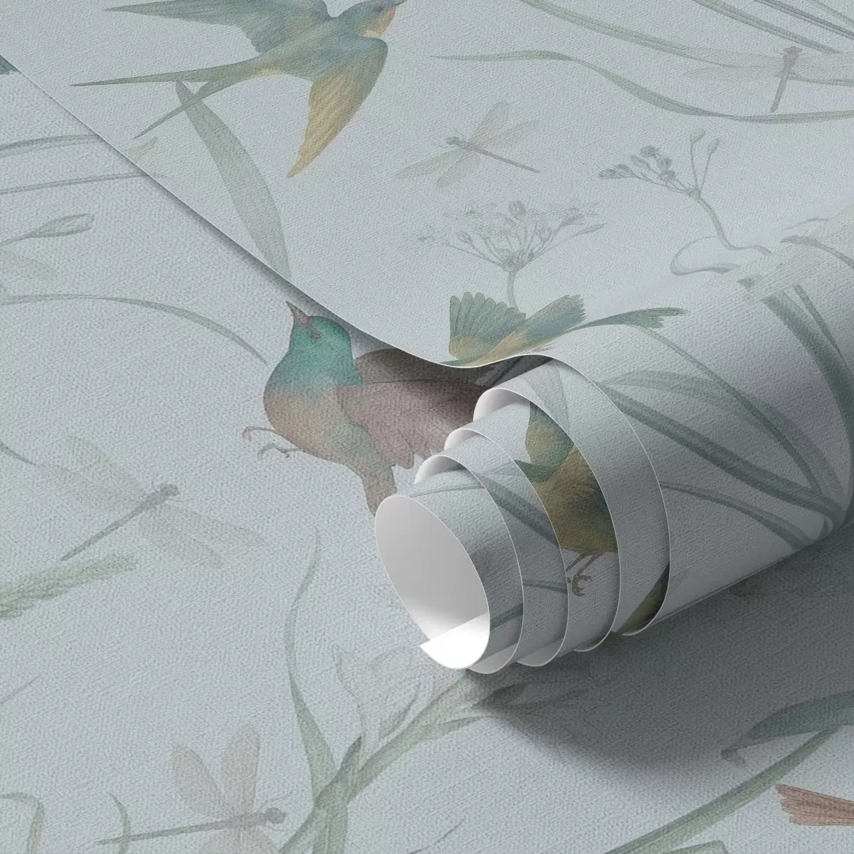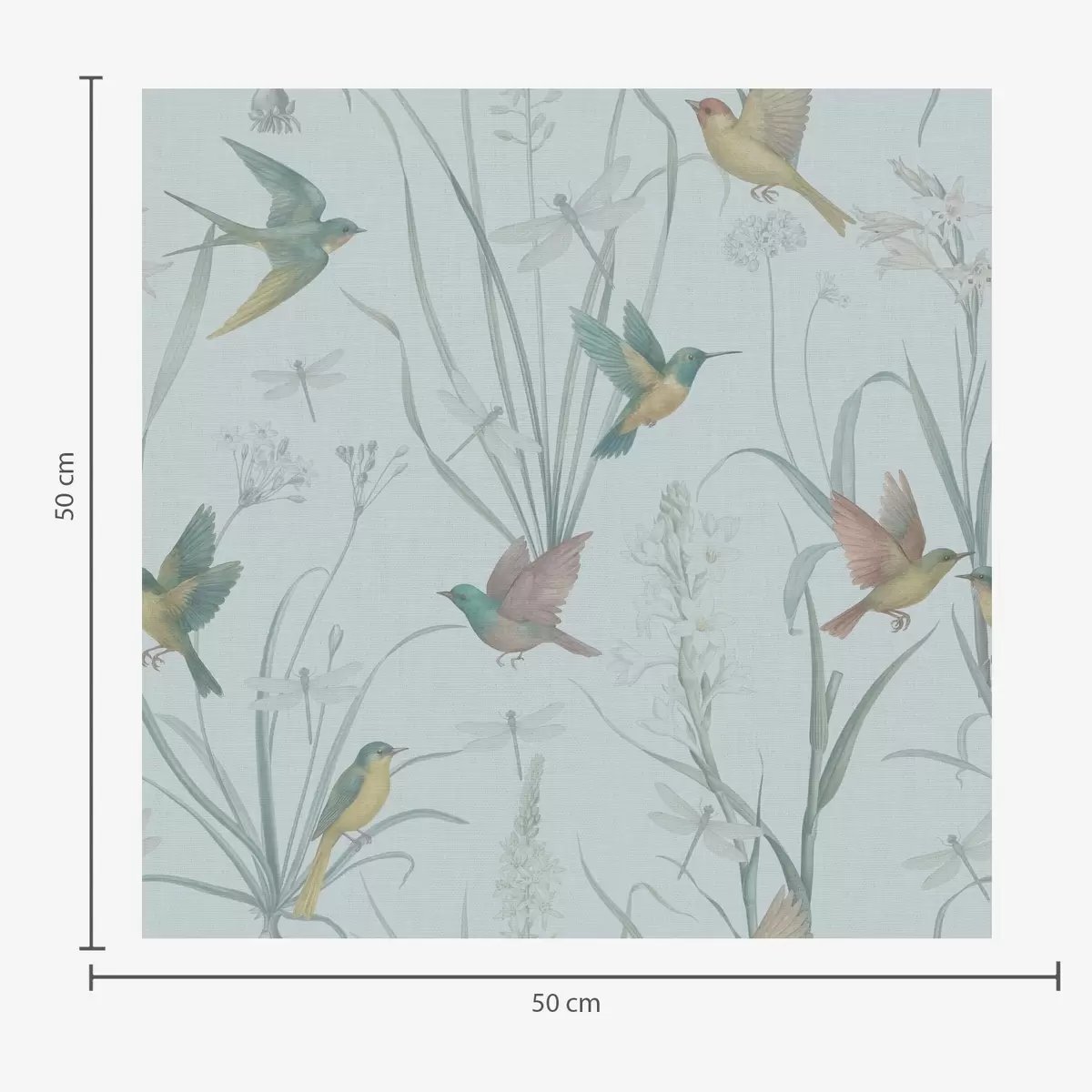 Papel pintado Pájaros entre la hierba del prado sobre un fondo gris azulado. Nr. a00776