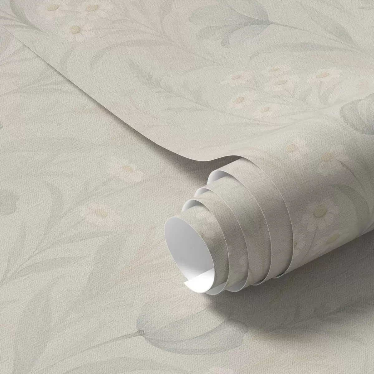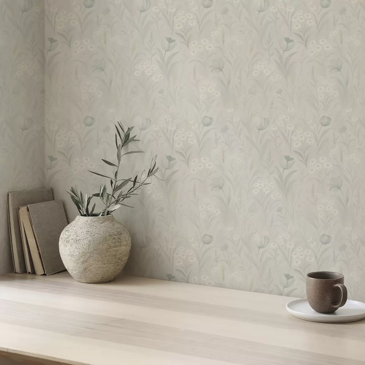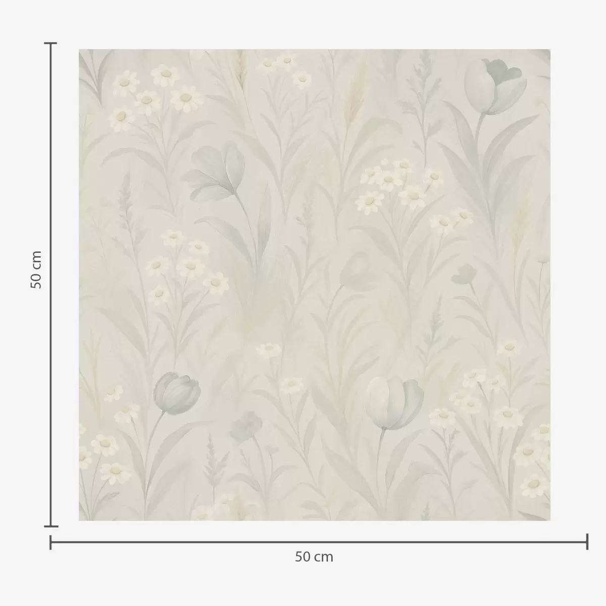 Papel pintado Suave pradera con tulipanes y margaritas, salvia pastel Nr. a00779