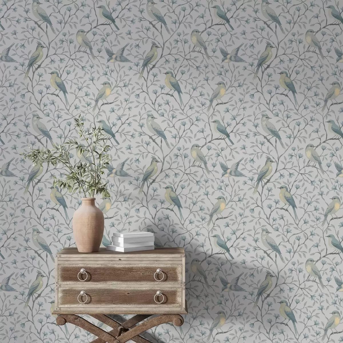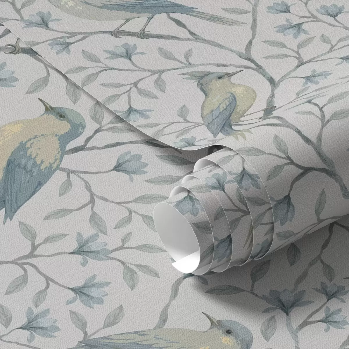 Papel pintado Pájaros en las ramas, esquema gris azulado Nr. a00782