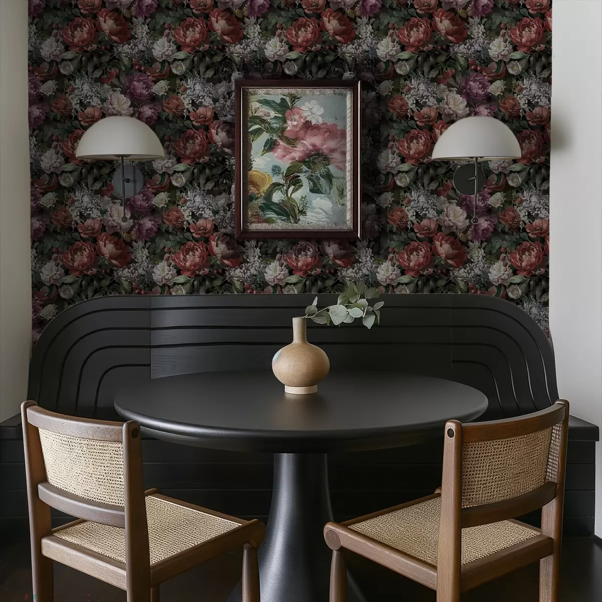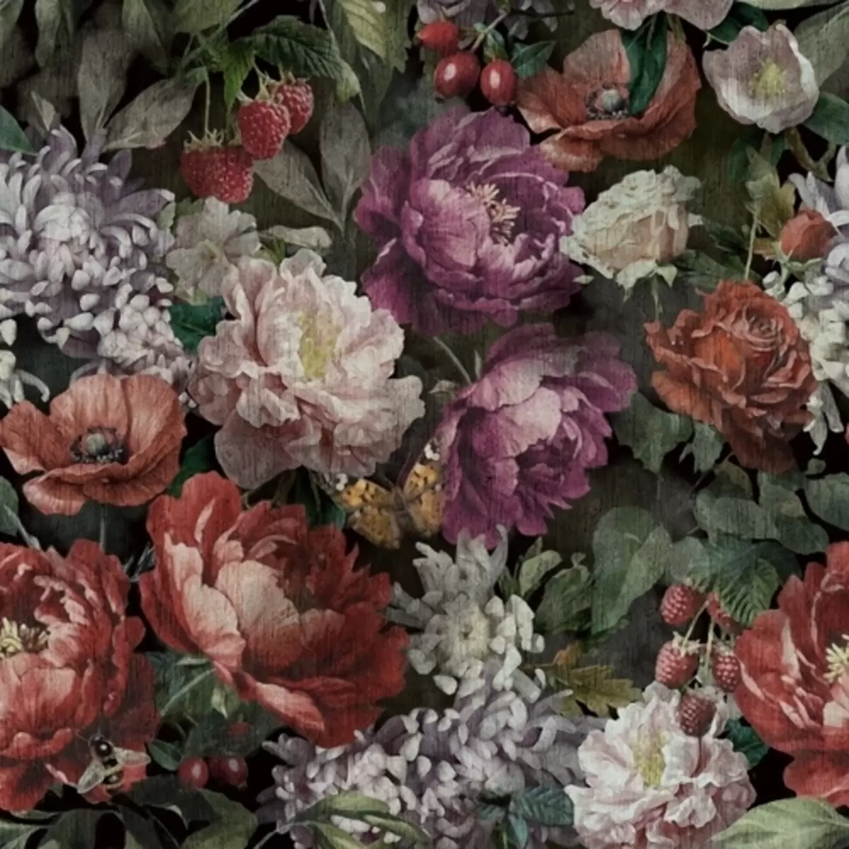 Fotomurales Peonías oscuras y dramáticas, bayas y mariposa sobre fondo negro. Nr. a00862