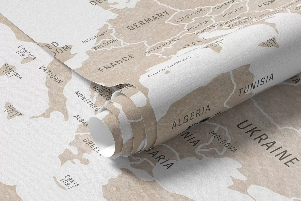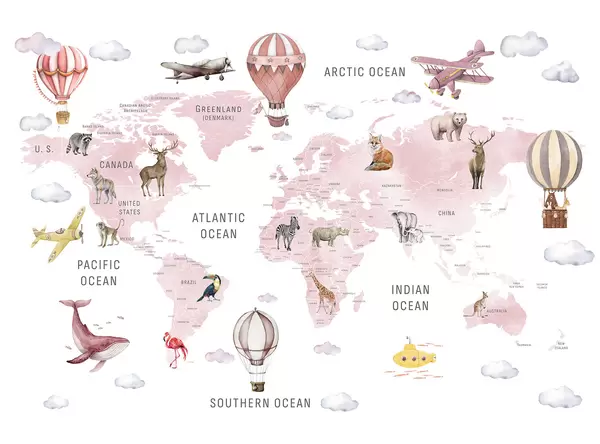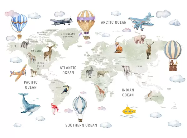 Fotomurales Mapa infantil en estilo acuarela con animales y globos aerostáticos. Idioma inglés. Color beige. Nr. c00001env2