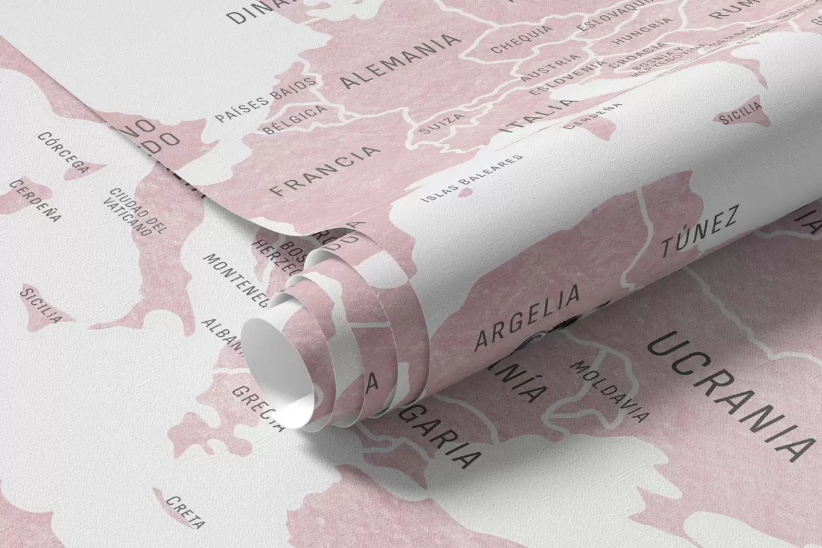 Fotomurales Mapa infantil en estilo acuarela con animales y globos aerostáticos. En español. Color rosa. Nr. c00001esv3