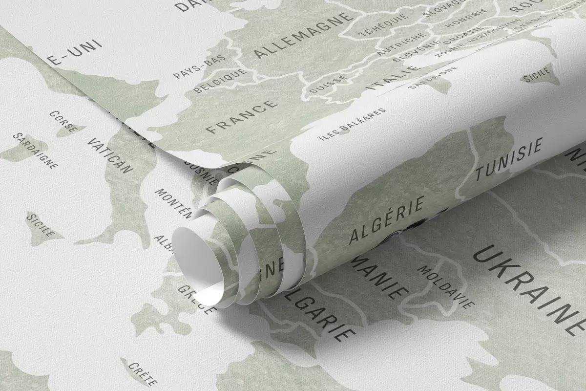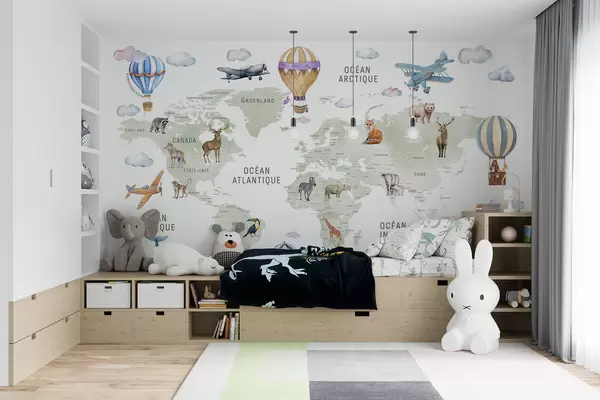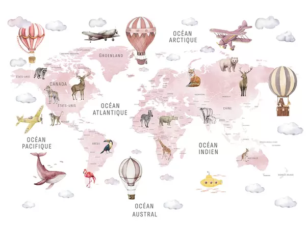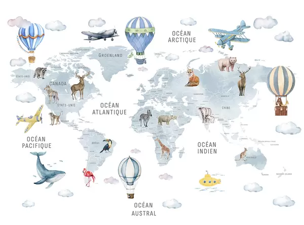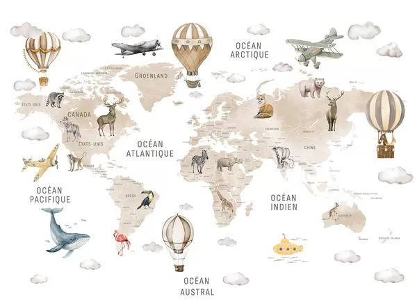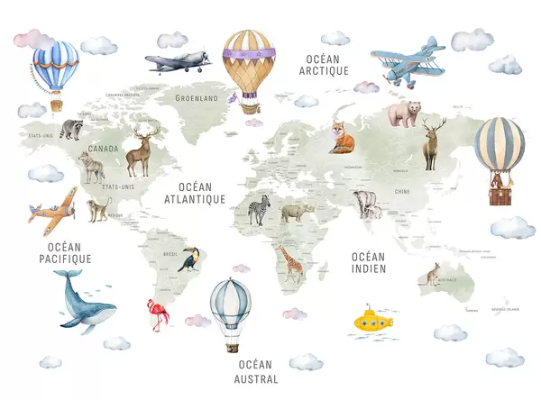 Fotomurales Mapa infantil en estilo acuarela con animales y globos aerostáticos. En francés. Color verde. Nr. c00001fr