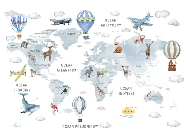 Fotomurales Mapa infantil en estilo acuarela con animales y globos aerostáticos. Idioma polaco. Color azul. Nr. c00001plv1