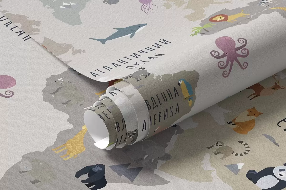 Fotomurales Mapa mundial infantil con animales y globos aerostáticos. Idioma ucraniano. Nr. c00002uk