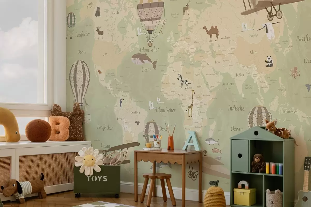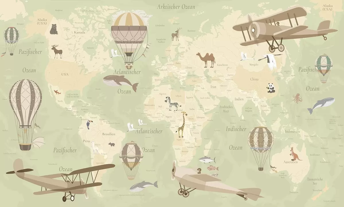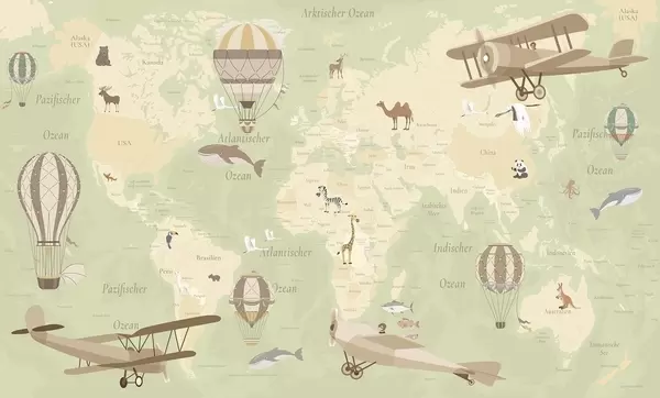 Fotomurales Mapa mundial infantil con animales, aviones y globos aerostáticos. En alemán. Color verde. Nr. c00003dev2