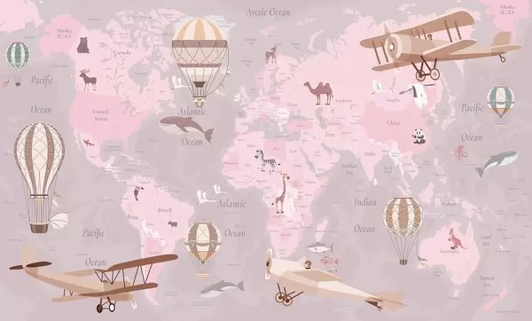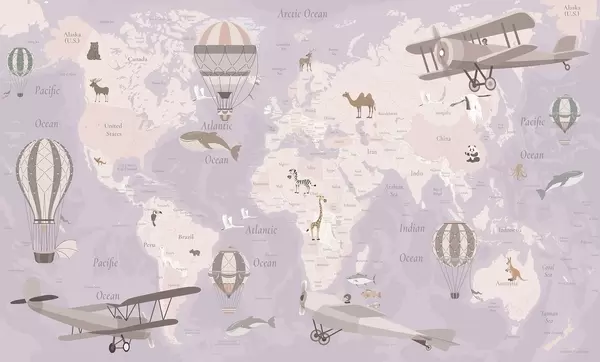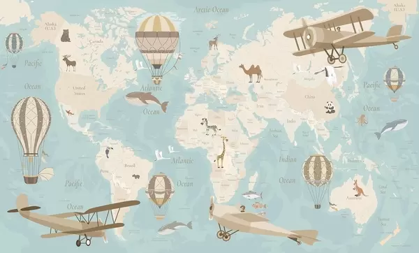 Fotomurales Mapa mundial infantil con animales, aviones y globos aerostáticos. En inglés. Color beige. Nr. c00003en