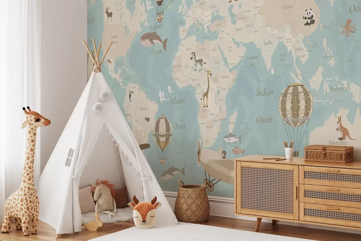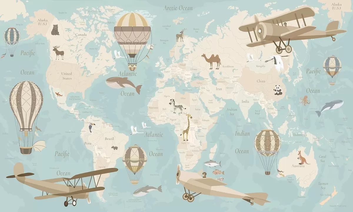 Fotomurales Mapa mundial infantil con animales, aviones y globos aerostáticos. Idioma inglés. Color azul. Nr. c00003env1
