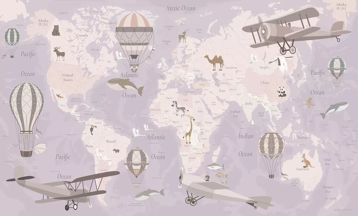 Fotomurales Mapa mundial infantil con animales, aviones y globos aerostáticos. En inglés. Color morado. Nr. c00003env4