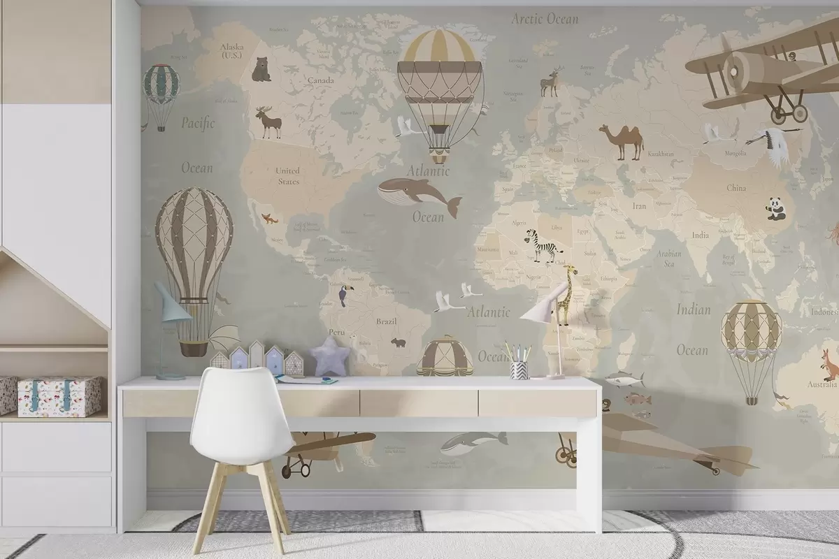 Fotomurales Mapa mundial infantil con animales, aviones y globos aerostáticos. En español. Color beige. Nr. c00003es