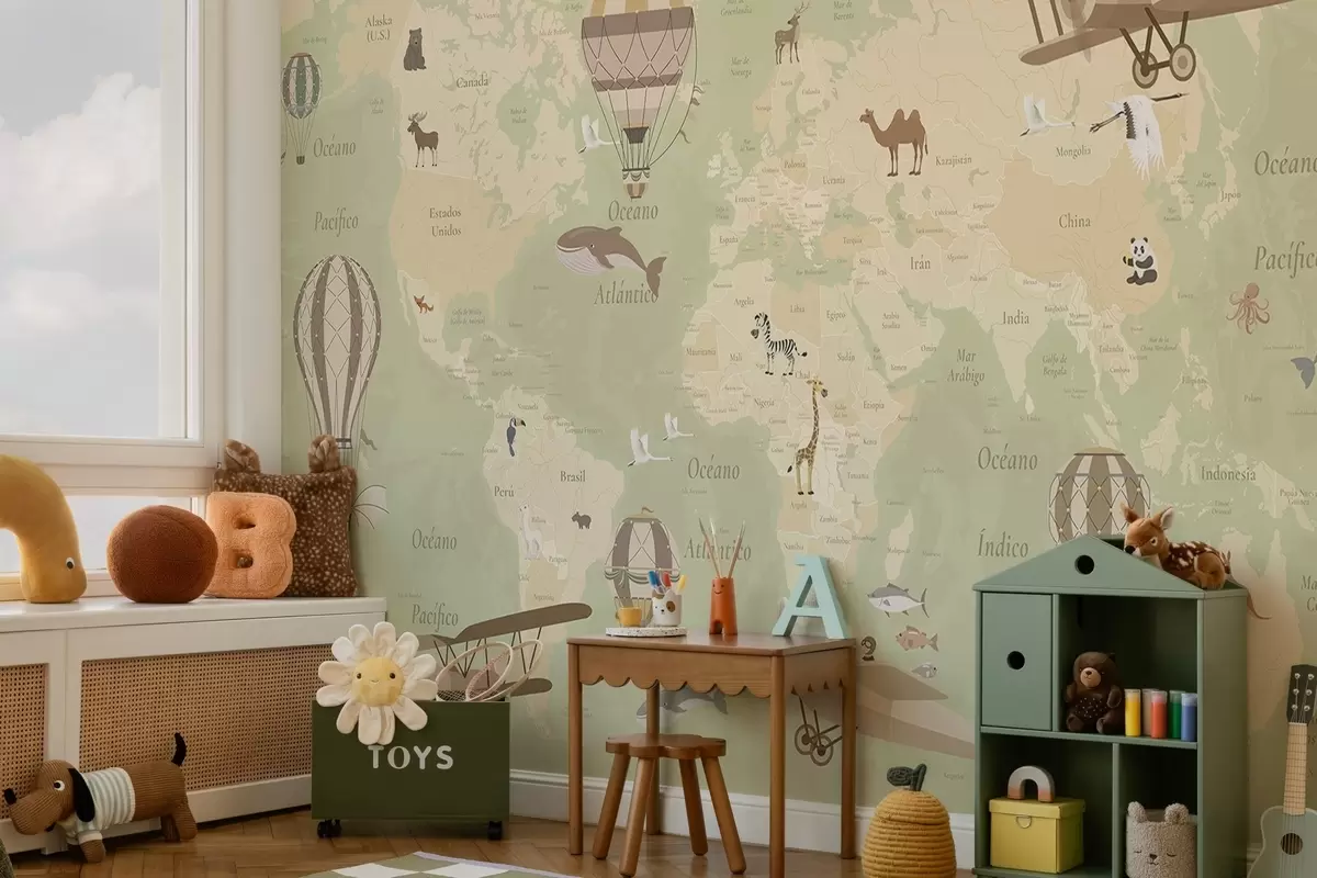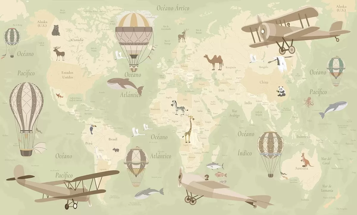 Fotomurales Mapa mundial infantil con animales, aviones y globos aerostáticos. En español. Color verde. Nr. c00003esv2