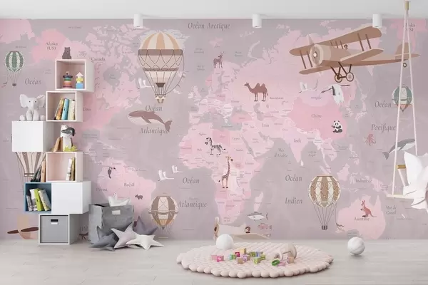 Fotomurales Mapa mundial infantil con animales, aviones y globos aerostáticos. Idioma francés. Color rosa. Nr. c00003frv3