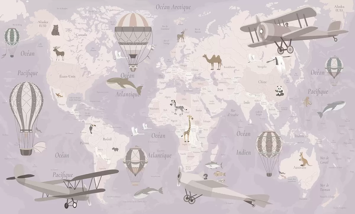 Fotomurales Mapa mundial infantil con animales, aviones y globos aerostáticos. Idioma francés. Color morado. Nr. c00003frv4