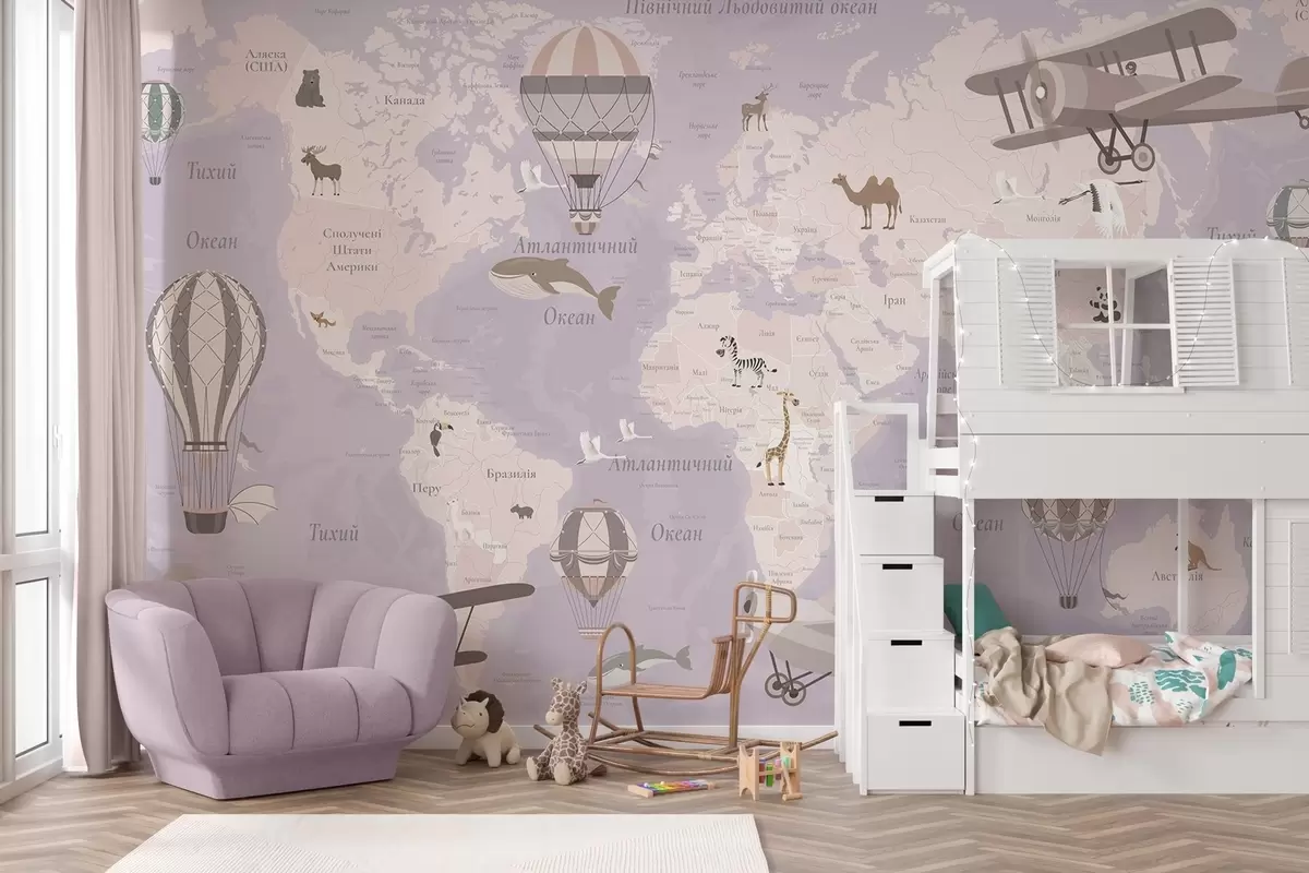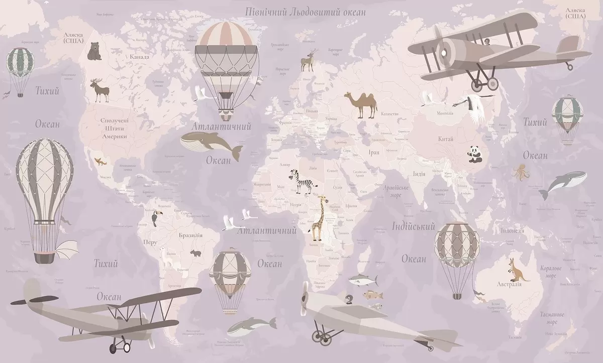 Fotomurales Mapa mundial infantil con animales, aviones y globos aerostáticos. Idioma ucraniano. Color morado. Nr. c00003ukv4