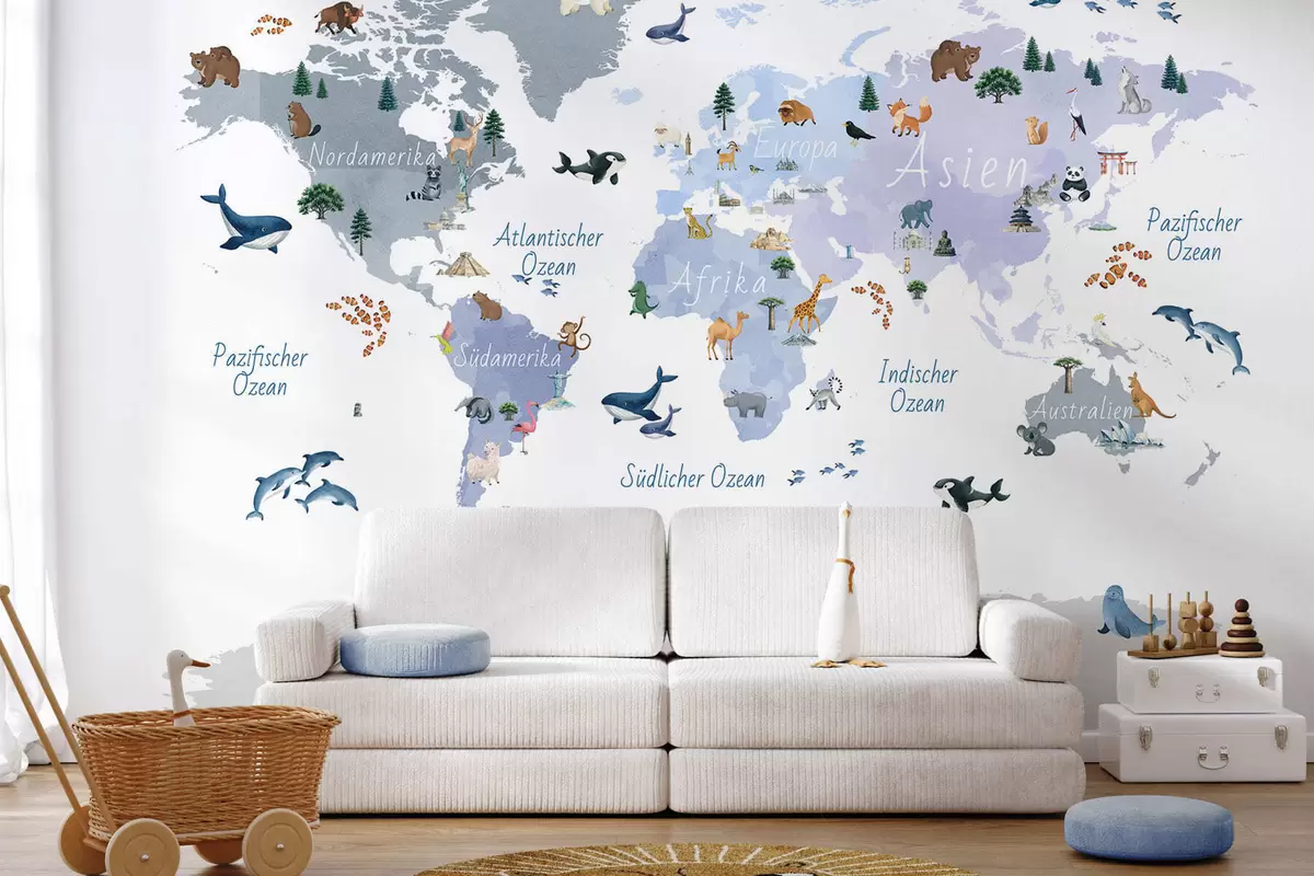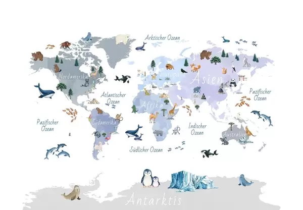 Fotomurales Un mapa azul de estilo acuarela en el que aparecen animales, plantas y elementos arquitectónicos. Etiquetas en alemán Nr. c00009dev1