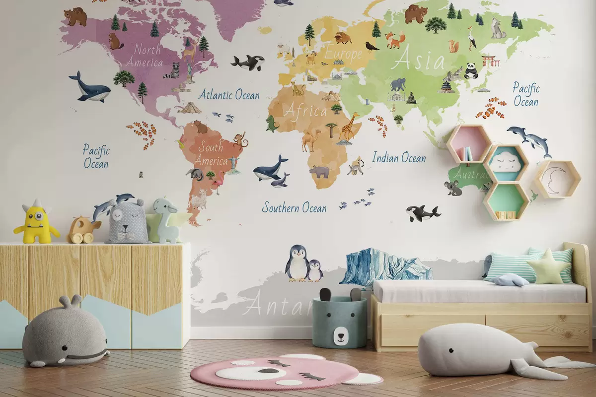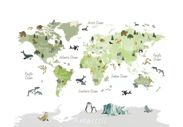 Fotomurales Un mapa a color con estilo de acuarela en el que aparecen animales, plantas y elementos arquitectónicos. Etiquetas en inglés Nr. c00009en