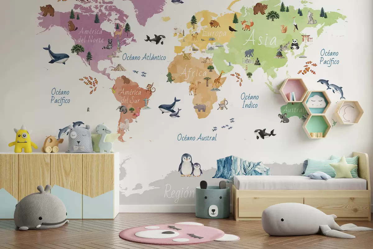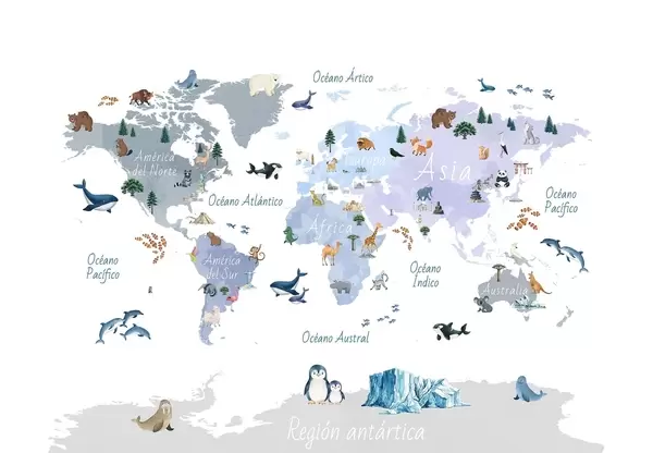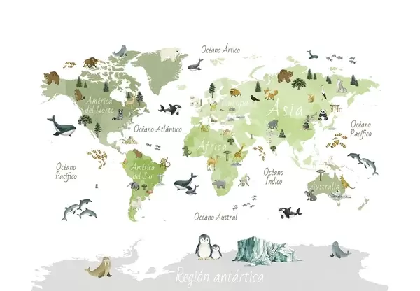 Fotomurales Un mapa a color con estilo de acuarela en el que aparecen animales, plantas y arquitectura. Etiquetas en español Nr. c00009es