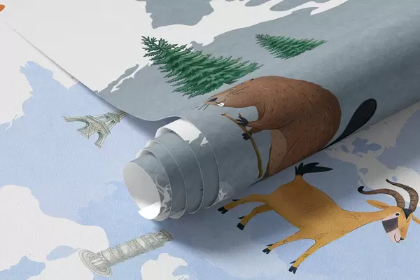Fotomurales Un mapa azul de estilo acuarela en el que aparecen animales, plantas y elementos arquitectónicos. Etiquetas en español Nr. c00009esv1