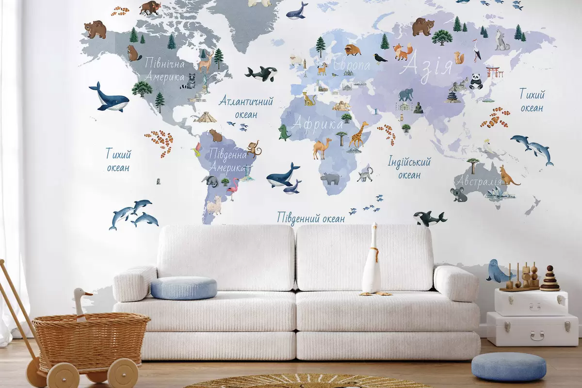 Fotomurales Un mapa azul de estilo acuarela en el que aparecen animales, plantas y elementos arquitectónicos. Rótulos en ucraniano Nr. c00009ukv1