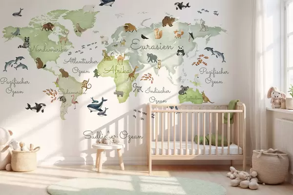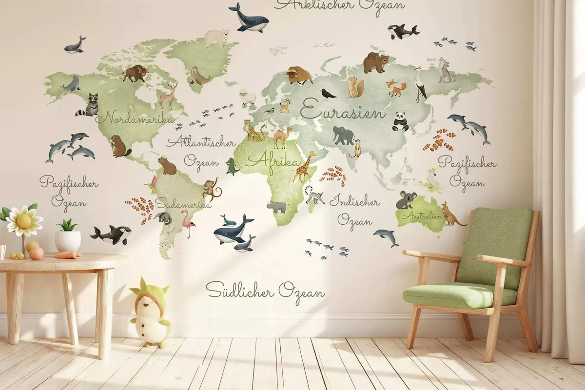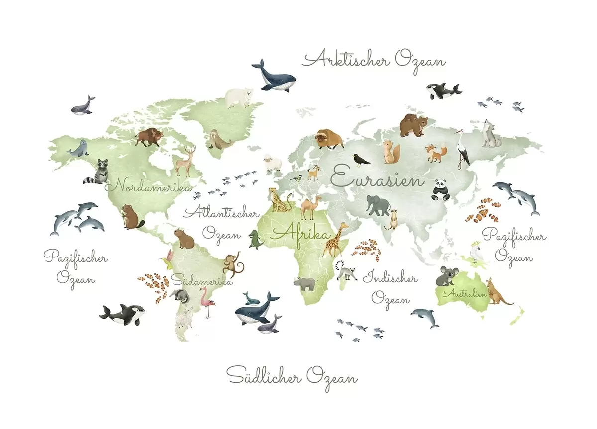 Fotomurales Un mapa verde con estilo de acuarela en el que aparecen animales. Etiquetas en alemán Nr. c00012dev2