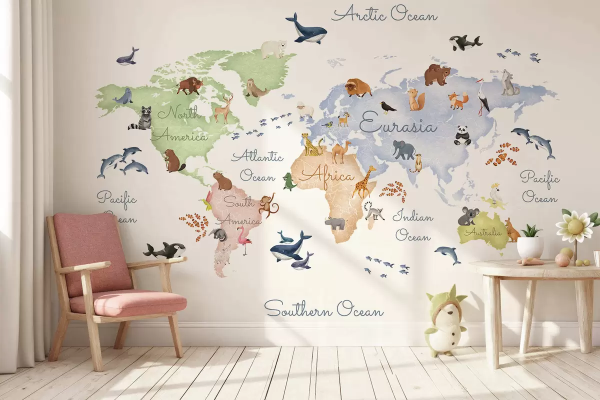 Fotomurales Un mapa a color con estilo de acuarela en el que aparecen animales. Etiquetas en inglés Nr. c00012en