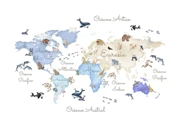 Fotomurales Un mapa a color con animales, en estilo acuarela. Etiquetas en español Nr. c00012es