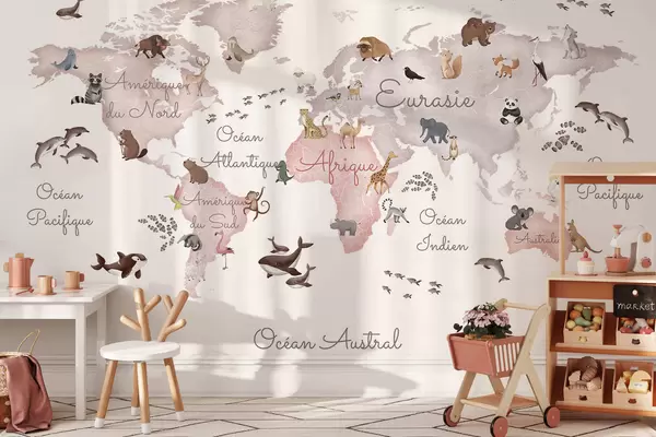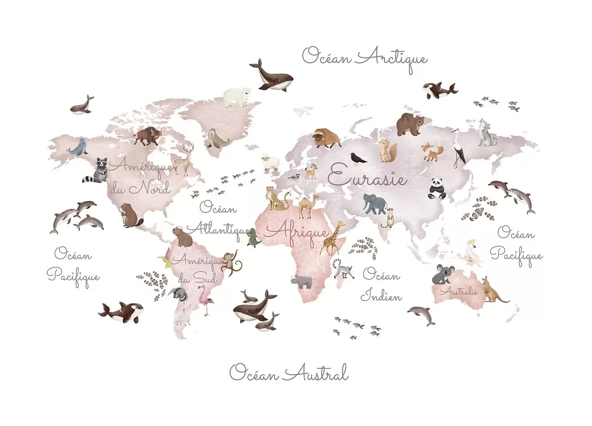 Fotomurales Un mapa en tonos beige, con un estilo de acuarela, en el que aparecen animales. Rótulos en francés Nr. c00012frv3