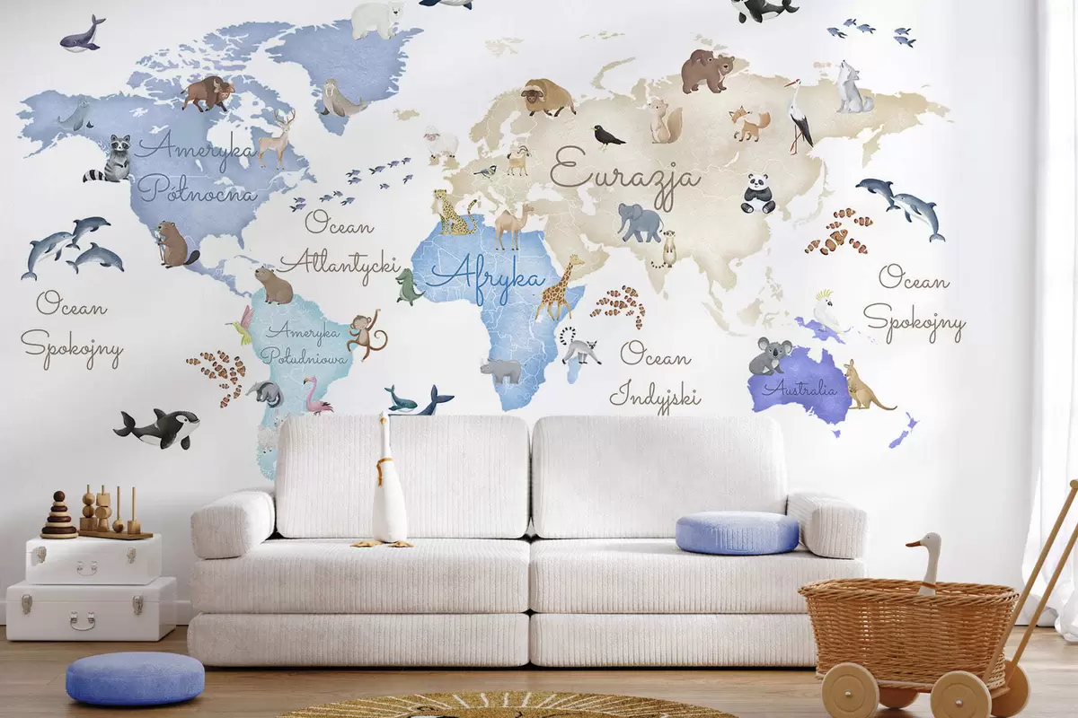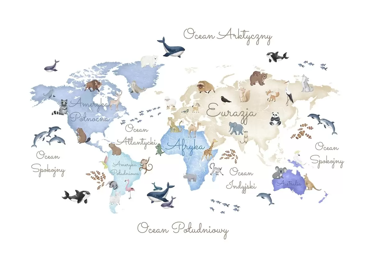 Fotomurales Un mapa azul con estilo de acuarela en el que aparecen animales. Etiquetas en polaco Nr. c00012plv1